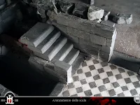 La posa dei primi scalini è immediatamente successiva alla pavimentazione dell'ingresso, quando ancora il piano terreno e il ripostiglio della legnaia sono scoperti.