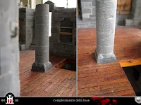 La base quadrata dovrebbe essere il pezzo più semplice da realizzare, ma per posizionarlo sulla testa della colonna inferiore senza che siano visibili fessure, mi vedo costretto a realizzare un incastro come nei mattoncini del "Lego". Scavando al di sotto del pezzo, questo si adatterà perfettamente al profilo del precedente, di ampiezza nettamente inferiore, ed eviterà che la base della colonna appaia sollevata rispetto alle assi del pavimento.