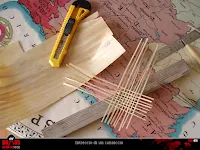 Para la construcción de la jaula opto por usar unas tiras de madera muy finas, obtenidas cortando un barquito de comida para llevar. Las voy cortando con el cutter, cruzándolas luego hasta formar un retículo regular, que cierro a dos extremos con unos listones más gruesos. Esta estructura resulta bastante fexible, así que (aunque no sin esfuerzo) consigo doblarla en "U" para poder insertarla en el hueco entre las piedras.