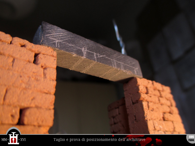 Luego, para solucionar el problema del desnivel, coloco dos listones de piedra en el umbral de acceso formando un pequeño escalón. Me doy cuenta de que este elemento también podría ser causa de graves accidentes: me imagino ya algún joven aprendiz tropezando en él y cayendo de cabeza por la trampilla abierta...