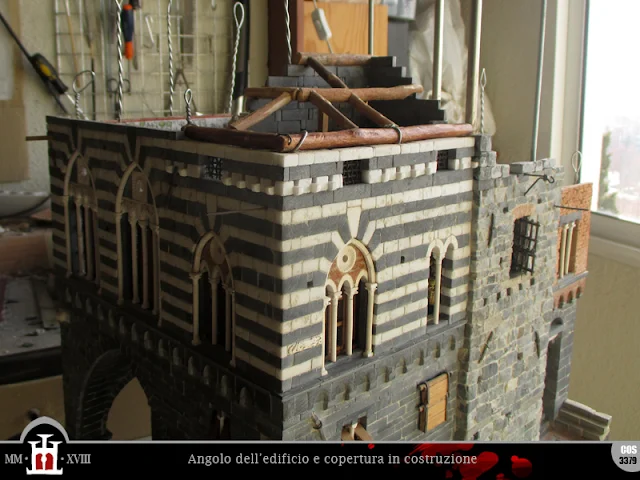 Anzi no, già che ci siamo poso anche qualche mattone sul paramento interno, così finisco di inglobare gli archetti delle finestre nella muratura.