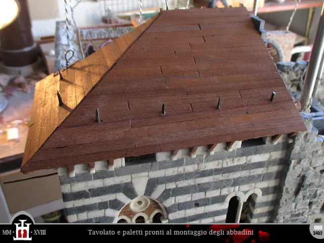 Non ho ancora realizzato abbastanza tessere da coprire tutto il tetto, ma alla lunga il lavoro risulta un po' monotono e ho voglia di iniziare a collocare i miei abbadini. Decido quindi di passare alla fase successiva, che però necessita di qualche intervento preliminare.