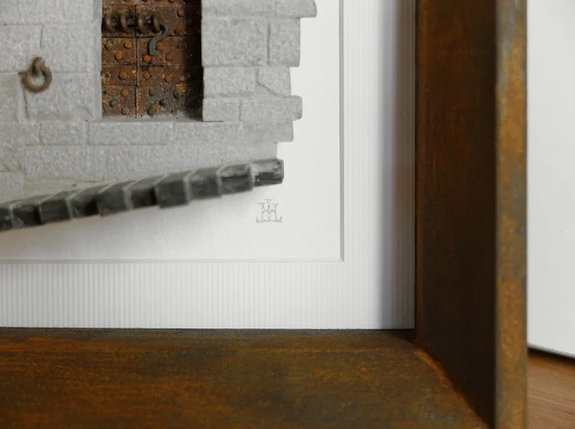 The materials used are: gray marble for the wall, Ligurian slate for the street paving, metal sheet, wire and pin heads for the door, cement, vinyl glue. All the elements that make up the piece are worked with manual or mechanical means without the use of molds, which makes it a unique work that will hardly be replicated with identical characteristics.